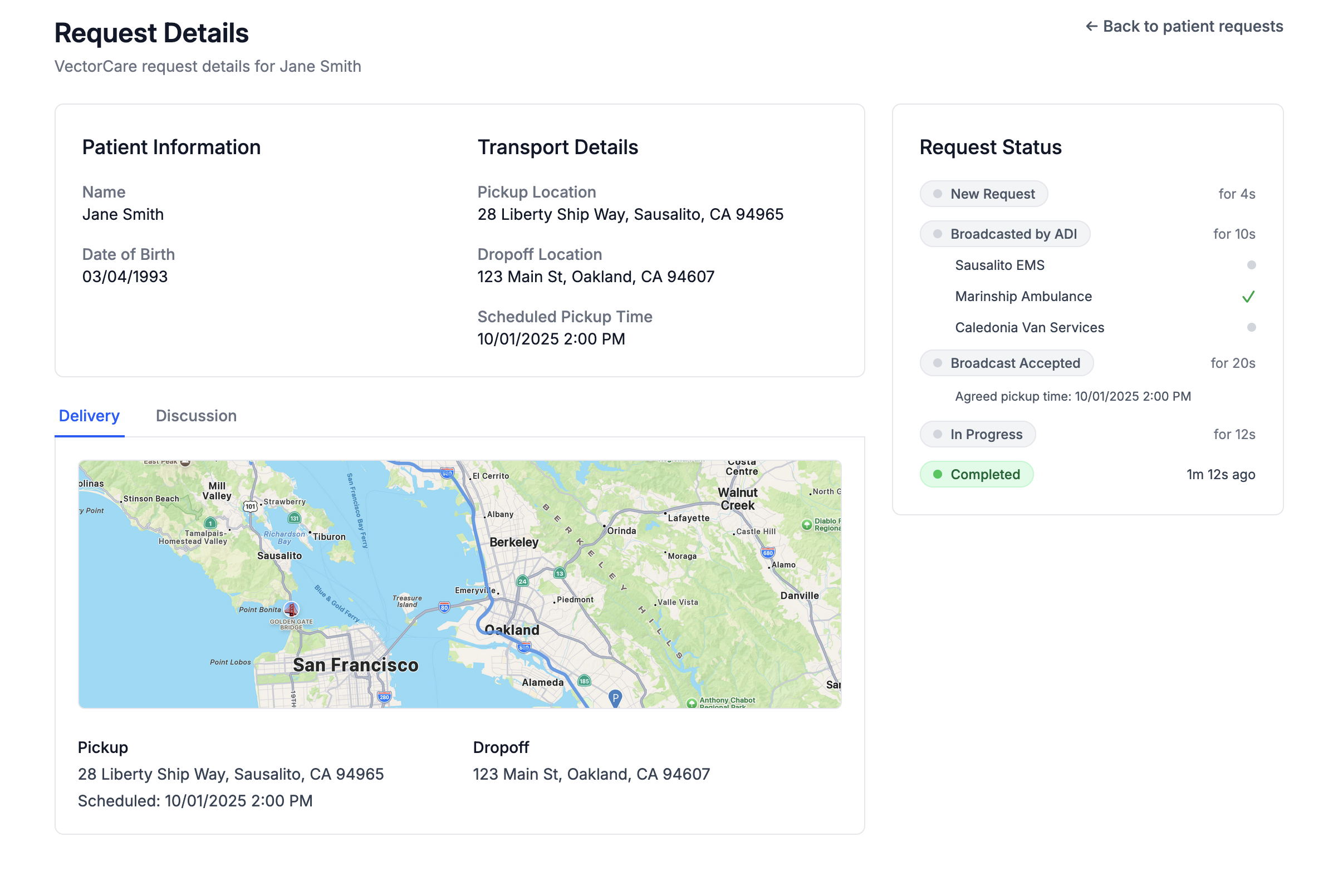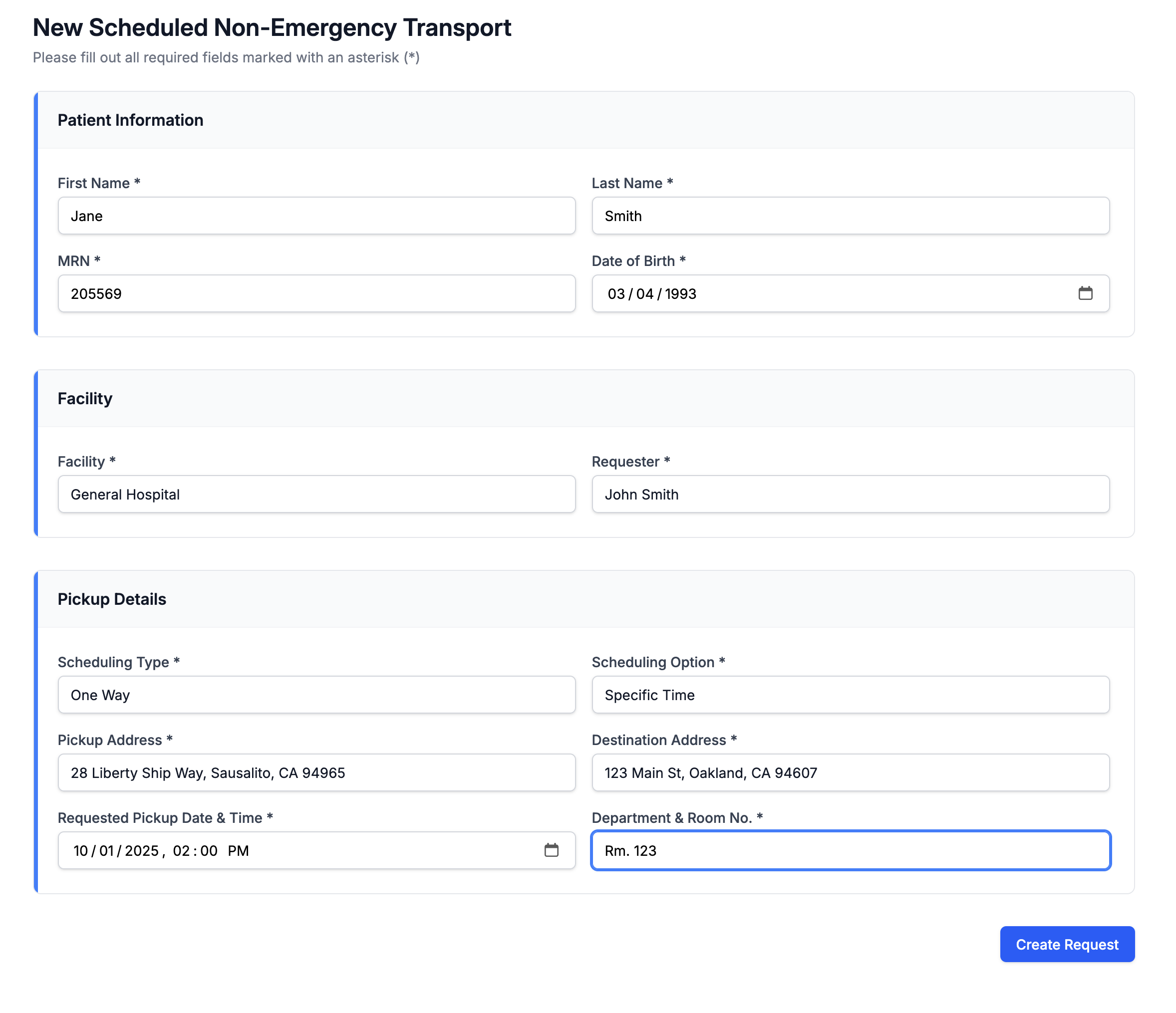 After selecting a service type, the Service Request Form appears. Many essential Patient details are pre-populated. Complete the required fields and click the Create Request button to continue.