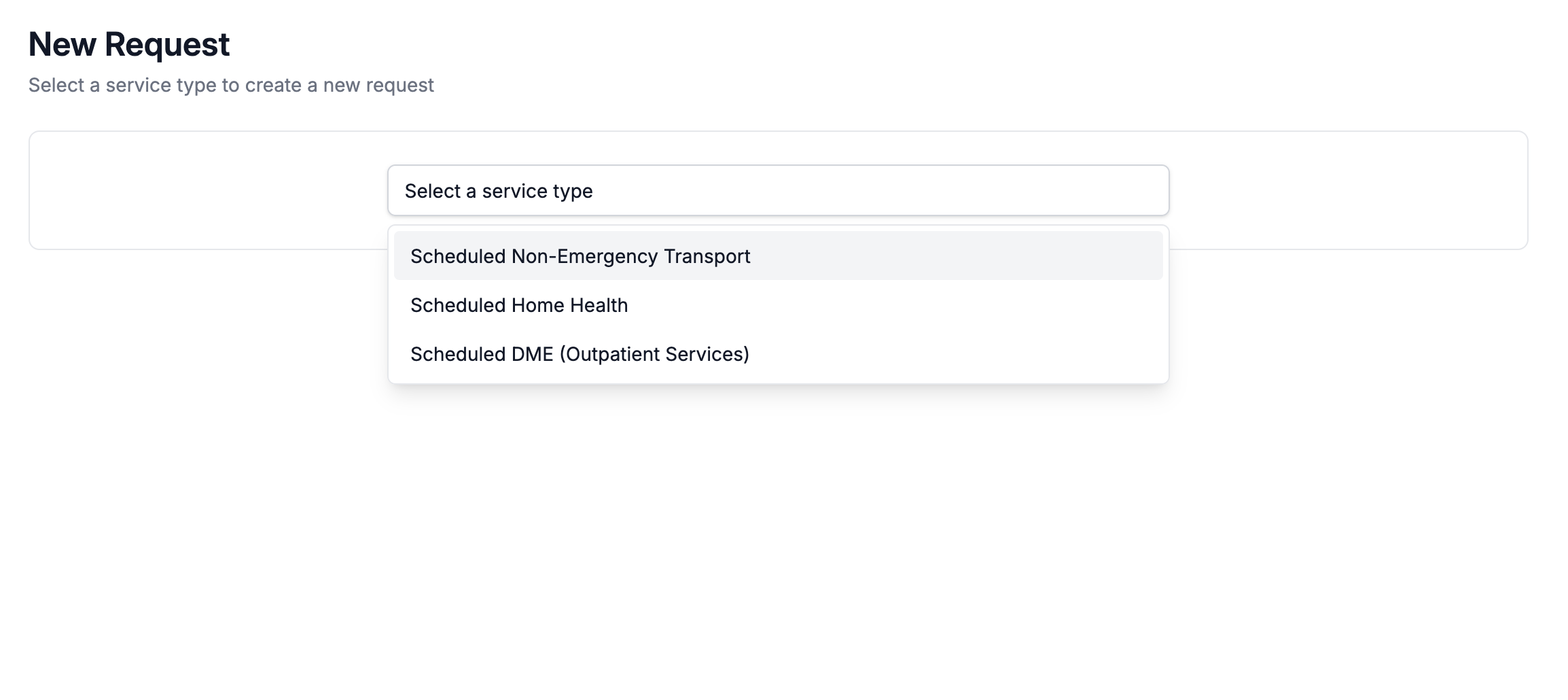 Next, select a service type from the dropdown. Depending on the access level set by your VectorCare administrator, you'll see a tailored set of options.