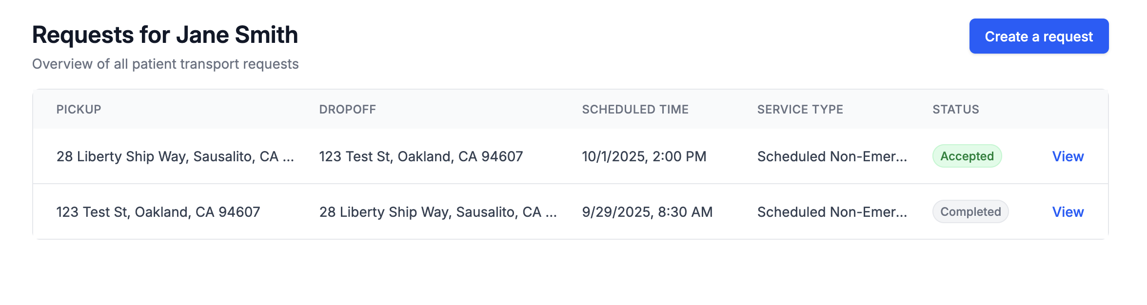 Upon launching VectorCare SMART on FHIR in your EHR, you land on the Patient Request List. Use this view to review active and historical requests for the Patient, or click Create a request to schedule a new one.
